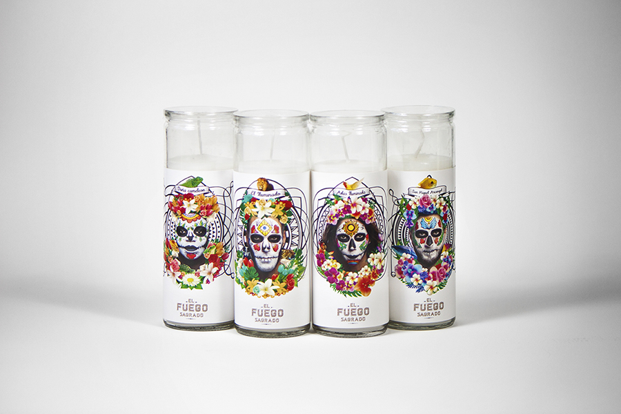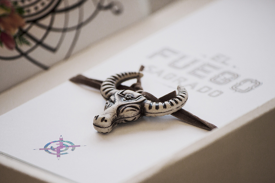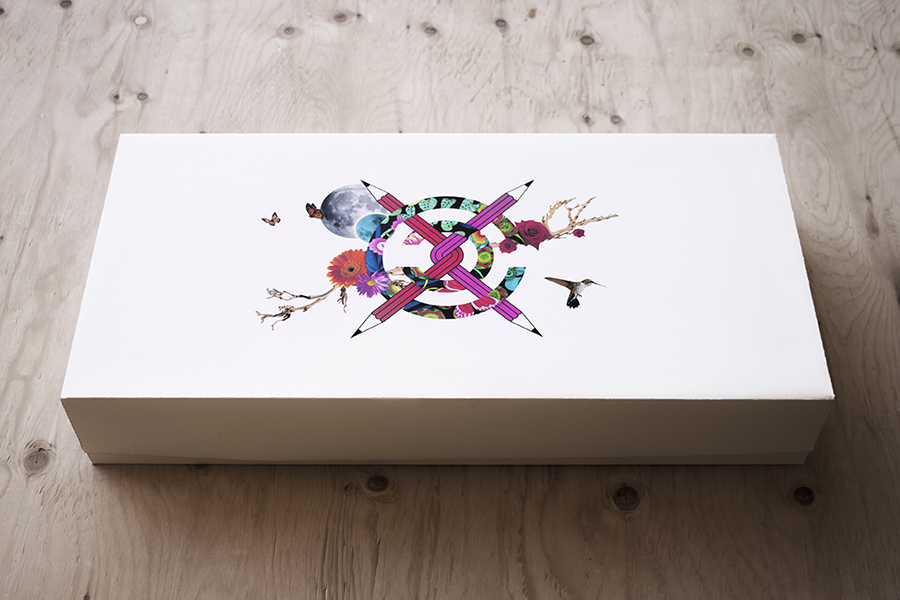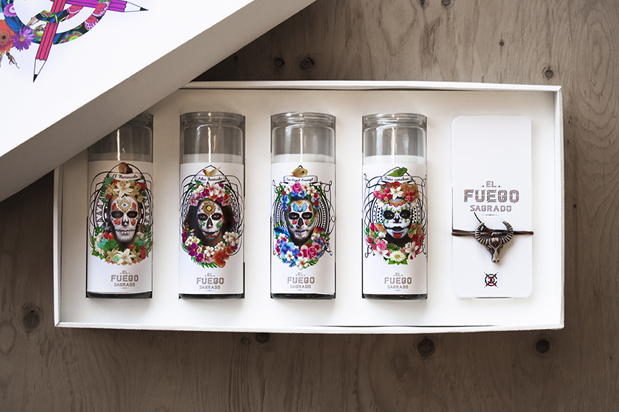 Boite avec 4 cierges incrustés et jeu de tarot. Chaque cierge représente un des membres du Clan Créatif. Il suffit de les allumer pour invoquer la créativité du Clan.
