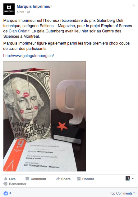 Le concours Gutenberg souligne et récompense depuis plus de 30 ans le travail des artisans imprimeurs Québécois! C’est avec grande fierté que nous avons accompagné Marquis Imprimeur à l’édition 2016 lors de la remise du prix Gutenberg Défi technique, catégorie Éditions pour notre projet Empire of Senses de Spiegelworld!